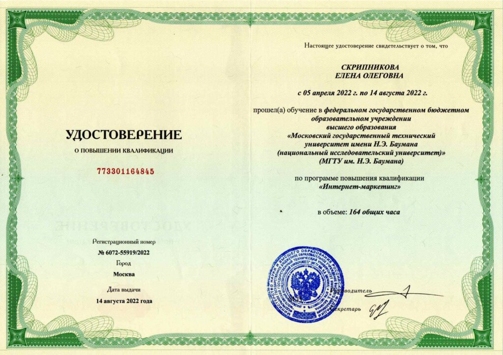 С 2020 года занимаюсь маркетингом: прошла профессиональную переподготовку в МГТУ им. Н. Э. Баумана по направлениям «интернет-маркетинг», «веб-разработка» и «психология продаж».
